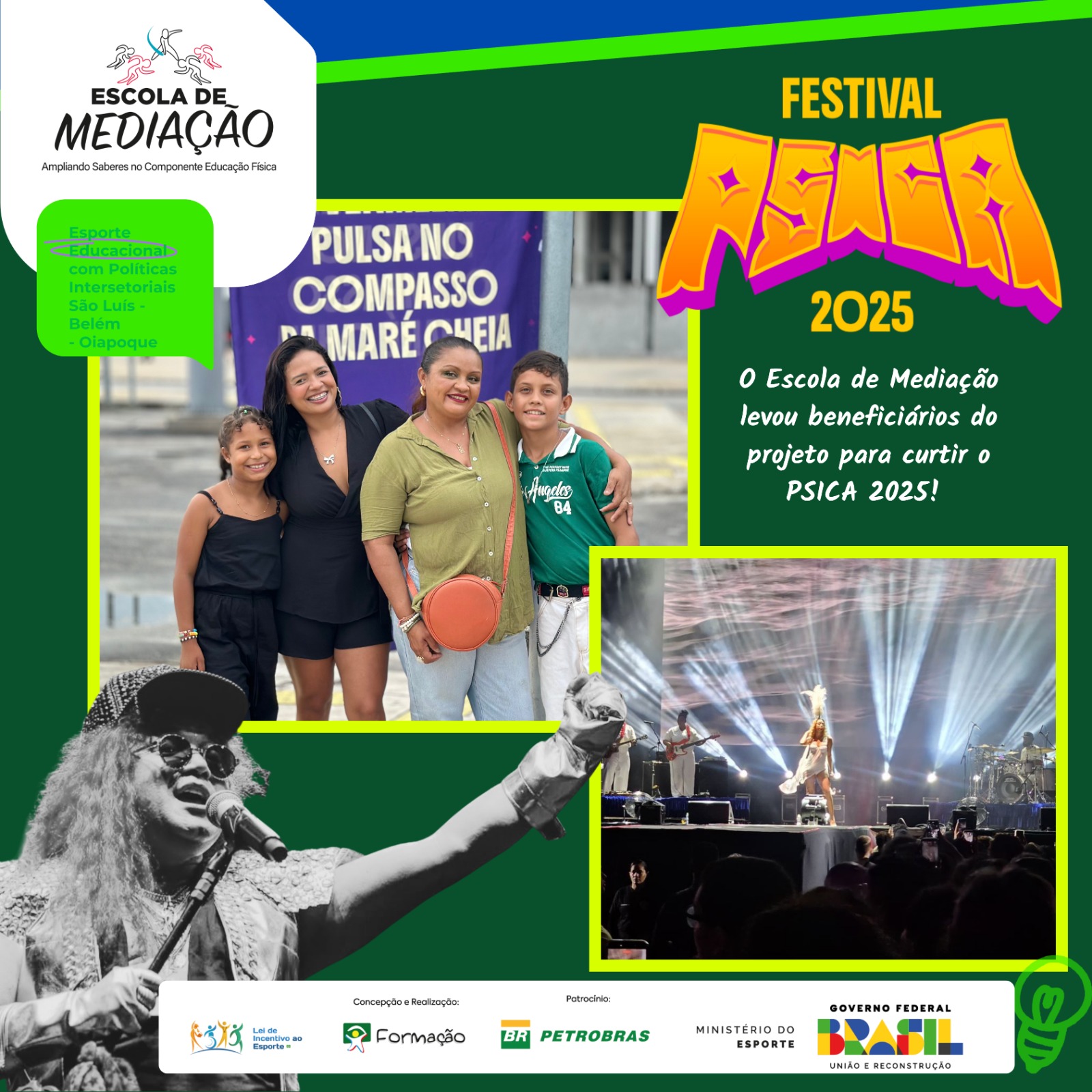 “O Projeto Escola de Mediação foi convidado a participar do Festival Psica pela Petrobrás, o que gerou a possibilidade de contemplar Profissionais, Parceiros e Beneficiários. Esse evento foi um marco para aqueles que participaram e reforça ainda mais aquilo que o Projeto tem como a principal ideia, que é levar a oportunidade e fortalecer vínculos entre as escolas, famílias e equipe. A pluralidade de atrações nacionalmente conhecidas nesse evento, valoriza ainda mais a cultura local e a oferta de entendimento sobre o que o Brasil tem como raízes de ritmos, vozes e emoções”.